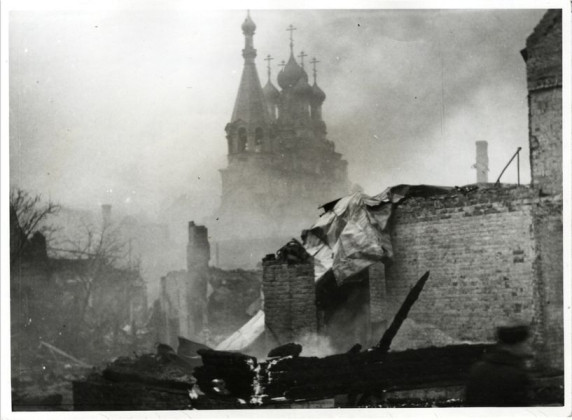 9 марта Пюхтицкое подворье в Таллине подверглось бомбардировке советских войск. Сгорел деревянный сестринский дом. В огне погиб иконостас левого придела Введенской церкви, пламенем были охвачены стены церкви, но пожар чудом прекратился. Сестры, лишившись крова, поселились в цокольном этаже храма, который ранее служил трапезной.