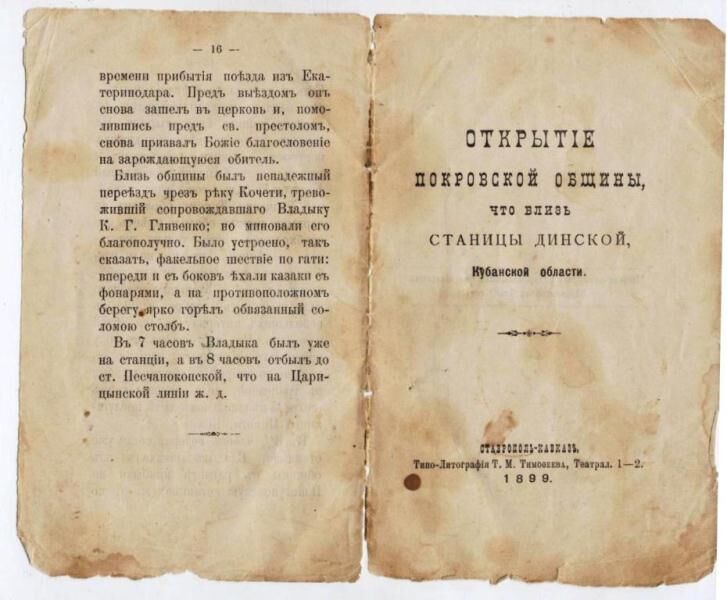 Пожелтевшая от времени брошюра с подробным описанием торжественного открытия Покровской общины в 1899 году преосвященным Агафодором сохранилась по промыслу Божию у одной прихожанки нашего монастыря в честь иконы Божией Матери «Всецарица». Сестра ее бабушки, Евсеева Фекла, была насельницей Покровского монастыря и умерла в возрасте 18 лет. Узнав, что мы создаем в Динском районе подворье, женщина подарила нам эту брошюру – их семейную реликвию. Называется она «Открытие Покровской общины близ станицы Динской, Кубанской области», состоит из 16 страниц и издана в 1899 году в типо-литографии Т.М. Тимофеева (Ставрополь-Кавказ). Перепечатана она из «Ставропольских Епархиальных Ведомостей». Адрес общины указан такой: чрез Пластуновскую станцию Ростово-Владикавказской железной дороги в Покровскую общину. Эта территория тогда относилась к Ставропольской епархии. При открытии общины в ней уже было 50 насельниц, управляла ею сестра Татиана Кончакова, впоследствии ставшая игуменией Рафаилой.