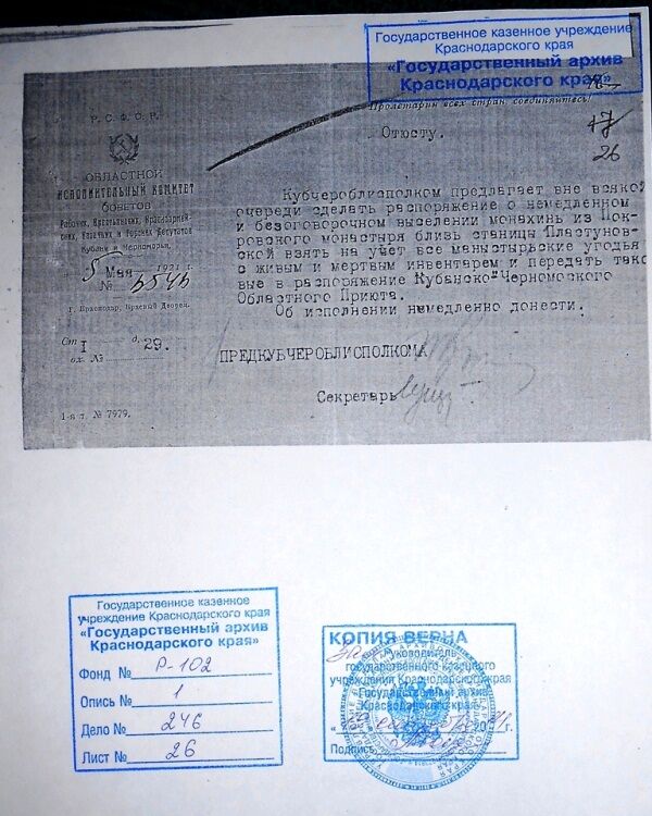 Но настоящую беду принесло монастырю восстановление на Кубани советской власти. Об этом тоже говорят архивные документы. 5-м мая 1921-го года датировано письмо, адресованное Отделу юстиции, за подписью Председателя Кубано-Черноморского облисполкома. Вот содержание этого письма, хранящегося в архиве: «Кубчероблисполком предлагает вне всякой очереди сделать распоряжение о немедленном и безоговорочном выселении монахинь из Покровского монастыря близ станицы Пластуновской, взять на учет все монастырские угодья с живым и мертвым инвентарем и передать таковые в распоряжение Кубано-Черноморского Областного Приюта». 24 июля 1921 года в присутствии понятых – священника и монахинь – заведующих ризницами – было описано все имущество храмов обители – от драгоценной алтарной утвари и облачений до швабр, ведер, совков и свечных огарков. Изъяты были также большие суммы денег. В акте от 28 июля 1921 года, подписанном секретарем Ликвидационного П/отдела и казначеем Отюста, указана сумма: «нашли их в количестве одного миллиона четырехсот тридцати семи тысяч восьмисот двадцати восьми рублей 26 коп. бумажными знаками, серебряной монетой 1 р. 05 к. и 2 монеты в 10 и 5 пфеннигов и медной монетой 14 р. 21 к.». Большевиками были изъяты все монастырские земельные угодья. Сделан обыск хозяйственных и жилых помещений (в том числе кельи игумении и жилья священника) и территории. Найдены и изъяты большие запасы зерна – всего было вывезено приблизительно пять с половиной тысяч пудов. Зерно вывозилось на ссыпной пункт станицы Динской и увозилось автомобилями в город Краснодар.