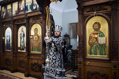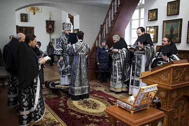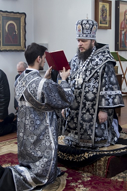 За Литургией Преждеосвященных Даров Его Преосвященству сослужили и.о. наместника монастыря архимандрит Кирилл (Костиков) и монашествующие епархии в священном сане.