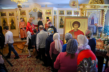 Перед началом богослужения состоялась торжественная встреча иконы небесного покровителя обители великомученика Георгия Победоносца. Это точный список новгородского образа конца XI – начала XII веков, который хранится в Успенском соборе Московского кремля. Икона создана по заказу одного из благотворителей обители на молитвенную память о его недавно умершем отце. «Наша семья связана с великомучеником Георгием очень тесно. Георгиями были мои дед и отец – так я назвал и сына», – рассказал Олег Кузьмин.