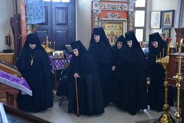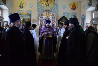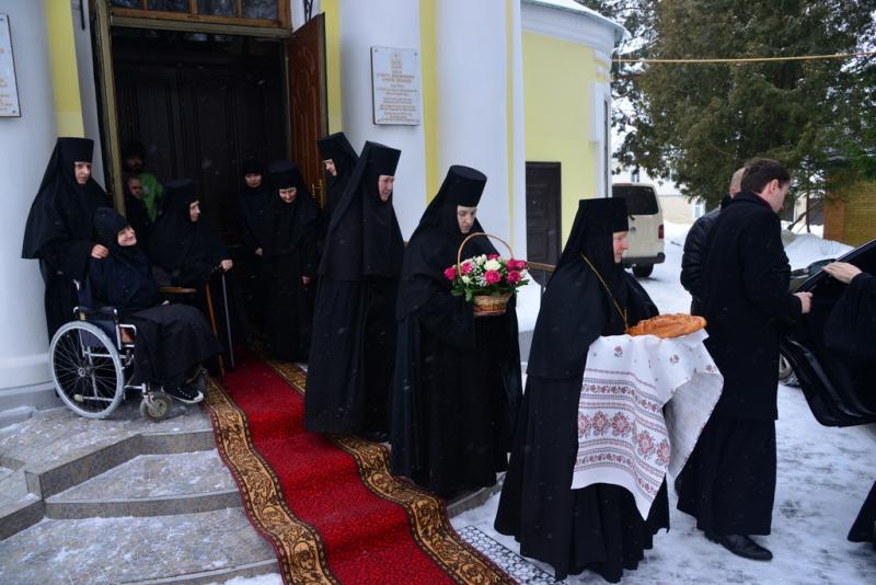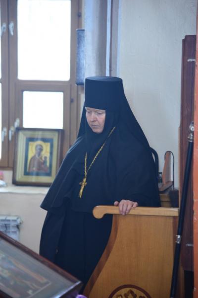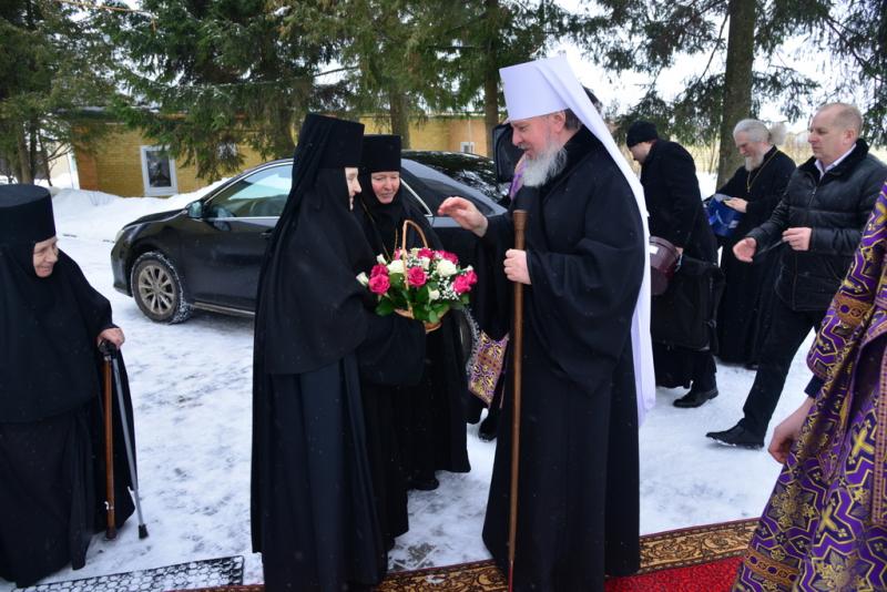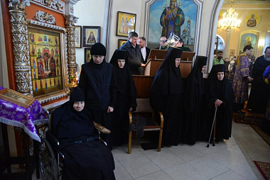 При входе в старинный монастырский храм в честь Воздвижения Креста Господня владыку Александра встречали настоятельница обители игумения Афанасия (Личаева) с сестрами.