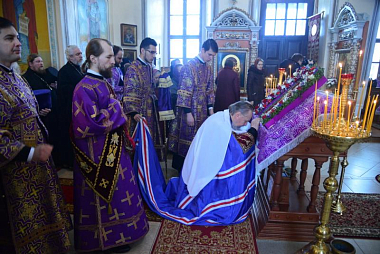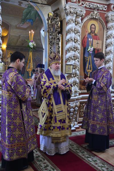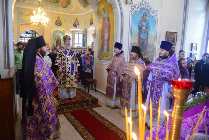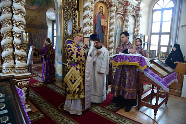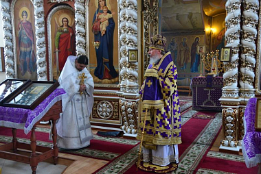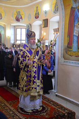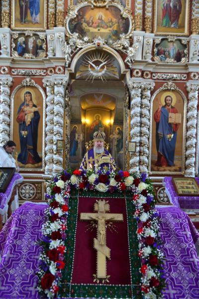 По окончании богослужения Владыка совершил славление Кресту Господню, накануне вечером изнесенному из алтаря на середину храма.