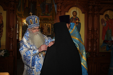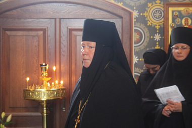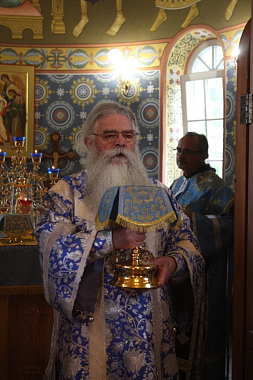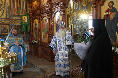 Затем митрополит Константин обратился к собравшимся с архипастырским словом и поздравил с праздником Успения Пресвятой Богородицы. В дар монастырю владыка Константин передал икону свт. Иннокентия Московского с частицей мощей.