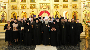 Его Высокопреосвященству сослужили епископ Ковровский Стефан, наместник Богородице-Рождественского монастыря г. Владимира игумен Кирилл (Сурков), ключарь Свято-Успенского кафедрального собора г. Владимира протоиерей Сергий Фестинатов, клирики Спасо-Преображенского монастыря и Свято-Успенского кафедрального собора.