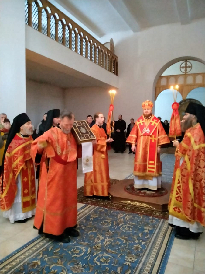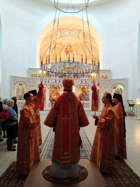 Его Преосвященству сослужил настоятель монастыря игумен Моисей (Пилатс), клирики обители иеромонахи Макарий (Чибисов) и Варсонофий (Молчанов), а также диакон Владимир Коркодинов.