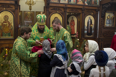По окончании богослужения архипастырь отслужил молебен преподобному Серафиму Саровскому перед его иконой, а затем иеромонах Дионисий (Шумилин) окропил молящихся святой водой.