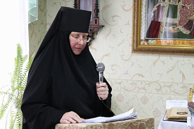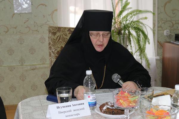С докладами выступили: настоятельница Выксунского Иверского женского монастыря игумения Антония (Миронова) на тему «Преподобный Варнава Гефсиманский и его духовное наследие»; старшая сестра Свято-Троицкого Островоезерского монастыря монахиня Серафима (Беляева) с докладом, посвященным духовному наследию преподобного Серафима Саровского; настоятельница Абабковского в честь Святого великомученика Николая воина и великомученика Георгия женского монастыря игумения Никона (Желякова) с выступлением об особенностях устава Серафимо-Дивеевского монастыря.