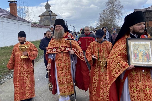 Перед началом шествия наместник Свияжского монастыря игумен Симеон (Кулагин) поздравил молящимся с пасхальными днями.