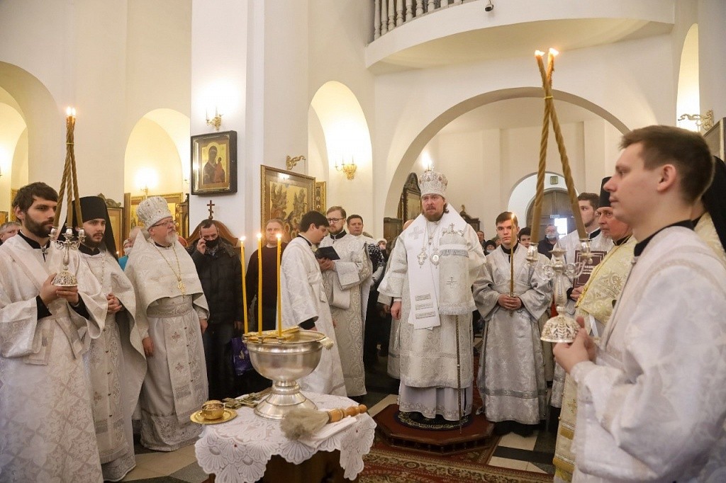 Правящему архиерею сослужили секретарь Челябинской епархии протоиерей Игорь Шестаков, настоятель Богоявленского монастыря игумен Нестор (Болков), другие клирики.