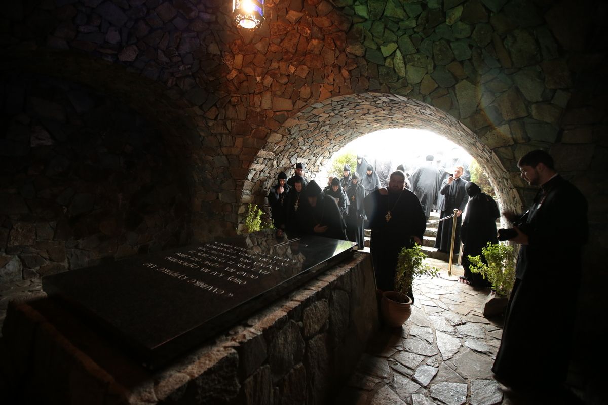 По окончании экскурсии делегация проследовала к месту захоронения первого Президента Республики Кипр архиепископа Макария III (1913–1977), который входил в число братии монастыря. У гробницы архиепископа митрополит Святогорский Арсений отслужил заупокойную литию. Молитвенные песнопения исполнил квартет студентов Московской духовной академии и семинарии, который сопровождает делегацию.