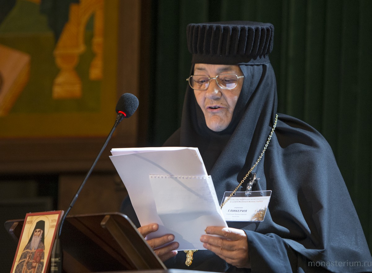 Настоятельница монастыря архангела Михаила в Челие (Сербская Православная Церковь) игумения Гликерия в сообщении «Пламенный монах и богослов: о преподобном Иустине Поповиче», вспоминая житие своего духовного отца, рассказала о том, как заботился преподобный о возрождении монашества в Сербии, как любил Россию и боролся за единство Церкви.