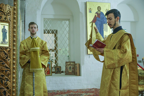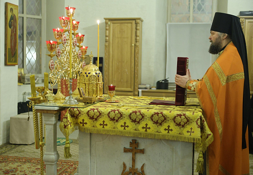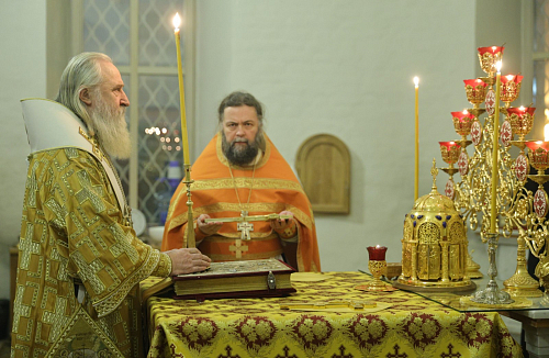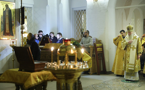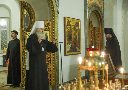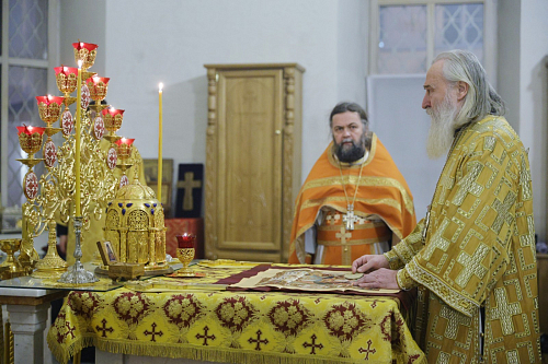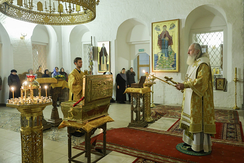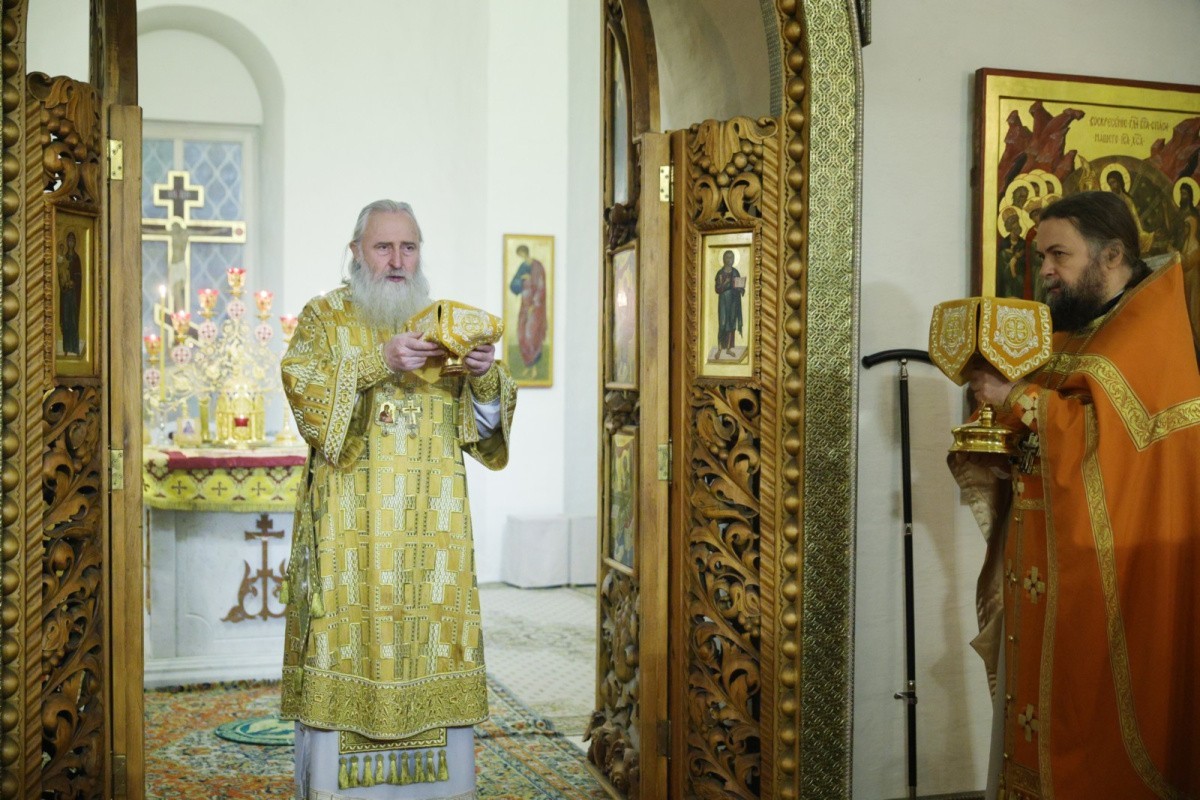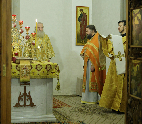 Его Высокопреосвященству сослужил наместник обители игумен Дионисий (Шлёнов). На богослужении пел хор монастыря. По совершении Литургии Высокопреосвященнейший владыка Феогност обратился к верующим, участвовавшим в службе, со словом проповеди.