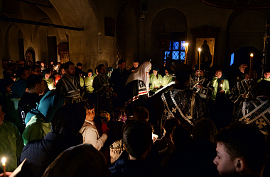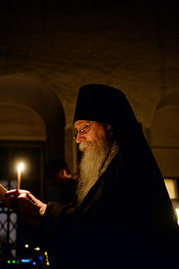 По окончании великого повечерия епископ Феофилакт приветствовал Святейшего Владыку и преподнес Его Святейшеству репринтное издание Требника свт. Петра (Могилы) и украшенную росписью шкатулку.
