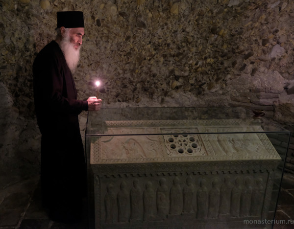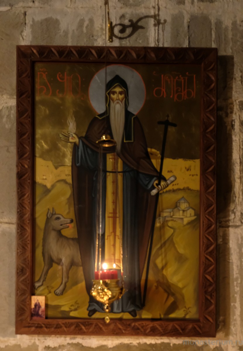 Предание говорит, что при преподобном были построены три храма: Иоанна Предтечи, Пресвятой Богородицы и Пресвятой Троицы. Там, где могила преподобного, храм VI века. А храм Пресвятой Богородицы, где мы сейчас беседуем, XII века, построил грузинский царь Давид IV Строитель. Рассказывают, что храм построен на основании старой церкви, которая была во времена преподобного. Его несколько раз разрушали, особенно в нашествие персидского шаха Аббаса I. В конце XIX – начале XX века этот монастырь восстановил епископ Гурийско-Мингрельский Александр (Окропиридзе). Сейчас он прославлен в лике святых, погребен тоже в нашем монастыре. Он очень благодетельствовал монастырю, при нем сделана роспись стен – русским мастером Андреевым.