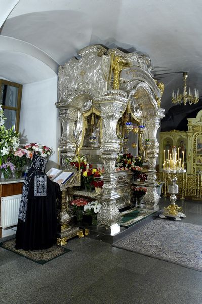 Как-то всё постепенно складывалось, художники рисовали, и наконец получился готовый проект. А потом самым сложным было найти, кому заказать изготовление раки по эскизу. Никто не решался, ведь это огромный объем филигранной работы – сделать серебряную раку. Наконец руководство Софрино согласилось – они даже специально открыли целый цех. Сень и рака были готовы к концу 2003 года, и, когда Святейший Патриарх Алексий II приезжал служить в обитель, ему очень понравилось.