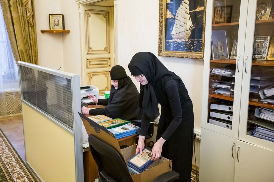 Мы по мере сил стараемся организовать всё так, чтобы был порядок, чтобы люди уходили утешенными. У сестер много послушаний: в храме, за свечным ящиком, в трапезной, на просфорне, в швейной, детском приюте, канцелярии, экскурсии проводят… Очень много получаем писем от прихожан по обычной и электронной почте, срочные телеграммы присылают с просьбой помолиться о тяжело болящих, в трудных жизненных ситуациях, судах и пр. Срочные письма сестры дают мне, я их сразу читаю; обычные письма сестры сами просматривают. Стараемся отвечать на все письма, послать иконочку или лепесточки освященные, чтобы людям хоть какое-нибудь утешение получить от Матронушки. Конечно, самое сложное послушание в канцелярии. На сестрах там лежит очень большая нагрузка, а их всегда не хватает, ведь нужно, чтобы это были люди с образованием и ответственные.