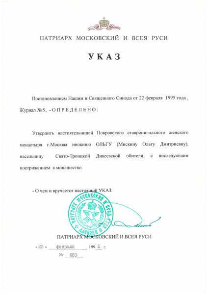 После этого я поехала в Патриаршую резиденцию в Чистом переулке, там подошла под благословение к Святейшему Патриарху Алексию II. Он мне вручил копию проекта устава монастыря, сказал изучить и подойти к нему к 17 часам. Я читала этот устав и совсем ничего не понимала. И плакала: кого Святейший хочет поставить открывать монастырь? Разве можно? Ведь я ничего в этом не соображаю. Решила уговорить Патриарха, чтобы он отменил мое послушание. И, когда подошла к Святейшему, сказала ему, что надо, чтобы кто-то со специальным образованием открывал монастырь и понимал, что написано в этих бумагах. Но Патриарх только улыбался: «Ты этот устав дай мне, я дам юристам, а ты должна открыть монастырь. Ты же в Патриархии за пятерых несла послушание и справлялась – я тебя хорошо знаю. Кого еще я могу поставить?» Я стала предлагать кандидатуры, кого можно поставить, но Патриарх отказывался. Потом он мне говорит: «У тебя большой опыт монастырской жизни – ты всё-таки жила в монастыре. Я же не могу поставить человека без опыта монашеской жизни».