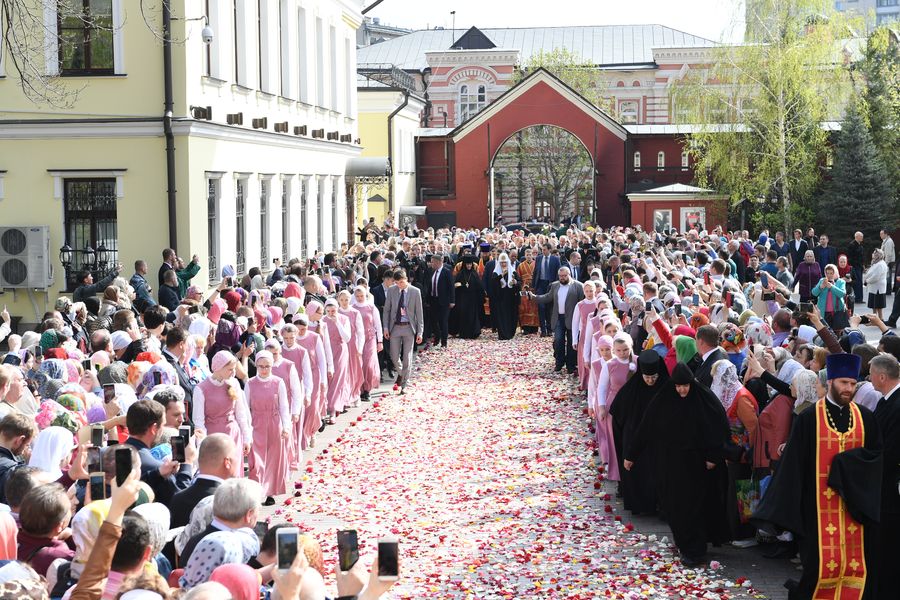 Мы заранее готовим дорожку, украшенную живыми цветами, вдоль которой выстраиваются паломники, и каждый хочет быть поближе, чтобы увидеть и сфотографировать Первосвятителя, получить благословение Его Святейшества. Следуя в храм, Святейший Патриарх Кирилл всегда благословляет прихожан, поздравляет их с праздником. За богослужением большинство паломников наблюдают по большому экрану, установленному на монастырской площади, т.к. наш большой Воскресенский собор не вмещает всех молящихся.