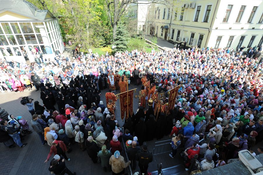 Ну а уже утром, начиная с 6-7 часов, монастырь вновь оживает, начинается обычная праздничная суета: каждую минуту прибывают новые и новые паломники, которые вскоре заполняют всю территорию обители, так что даже очередь к мощам в монастырском парке стоит в несколько рядов.
