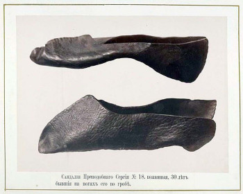 Сандалии, как указано на витрине (хотя они больше похожи на тапочки, однако у современного человека может появиться ассоциация с домашними тапочками, поэтому так подписали), были изготовлены преподобным Сергием. Он сам их выкроил из натуральной кожи, сам сшил. По написанному преданию, 30 лет пролежал в них во гробе. С тех пор, как его ученик преподобный Никон, первый игумен нашей святой обители, в 1422 году обрел во время строительства нового храма нетленные мощи своего учителя и наставника, и началось почитание святого: тапочки-сандалии Преподобного и нетленные его одежды неотлучно находятся в Лавре. Это фелонь, епитрахиль, поручи, еще есть посох. А тапочки-сандалии были переданы нам в Академический музей... Что касается богослужебных сосудов, это вопрос, вырезал ли их сам Преподобный или нет. Но имеется одна важная деталь: священные сосуды из нашей экспозиции прежде стояли возле раки с мощами преподобного Сергия. По всей вероятности, ученики святого хранили богослужебные сосуды периода земной жизни Преподобного как зеницу ока и потом, видимо, в знак того, что те всегда находились рядом с аввой, сделали их копии. В итоге получилась некая музейная экспозиция: сандалии, богослужебные сосуды. А еще, если Вы посмотрите на дореволюционные литографии, то увидите прямо над ракой фелонь преподобного Сергия. Ну кто бы мог подумать, что ученики Преподобного захотят сотворить музей? Но они сохранили все эти вещи как знак неотъемлемого пребывания с ними Игумена Земли Русской. Сделали это для того, чтобы память о нем не оскудевала. И мы, спустя семь с лишним веков, прекрасно понимаем, что преподобный Сергий, наш отец, – авва. Знаете, с чего я начинаю свой разговор с вновь пришедшими студентами на уроке, будь это такой предмет, как Церковный устав или Литургика, или история Русской Церкви, которые я преподаю? С поразительного момента из жития Преподобного. Откровенно говорю им: «Ребята, вспомните, пожалуйста, что, будучи отроком, преподобный Сергий "ели бредяху по Псалтири": грамота давалась ему плохо, за что учитель его наказывал, товарищи над ним насмехались, родители печалились. Вспомните, как со слезами на глазах отрок взмолился ко Господу и, получив от Бога через ангелоподобного старца-черноризца частицу святой просфоры, стал читать по-другому – стройно и без труда. В этом – чудо для преподобного Сергия, но в то же время и назидание для студентов: если ты плохо читаешь, ты ученик Преподобного. Обратись сердцем ко Господу, попроси Всевышнего даровать тебе книжное разумение! А если ты хорошо читаешь и при этом задираешь нос, Боженька тебя обязательно смирит». И гостям я обычно говорю: «Вы приехали сюда не ко мне, не в Академию, не в Лавру, а к преподобному Сергию, – значит, вы тоже его ученики Его. Он вас сюда привел. Помолитесь в храме, приложитесь к чудотворным мощам святого и не забудьте посетить наш Церковно-археологический кабинет, который не просто музей, а именно Кабинет – то есть особая учебная аудитория как для студентов Московских Духовных школ, так и для всех вас».