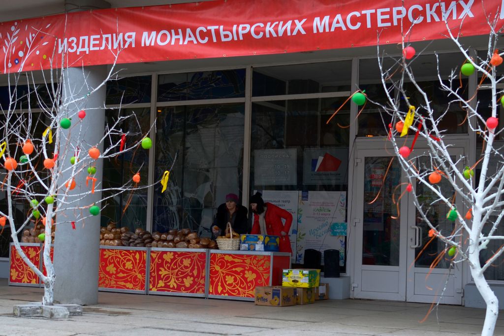 В это время года ярмарки устраиваются на улице, у монастыря есть специальное оборудование (праздничные шатры), которое наша команда возит с собой по городам и странам. На территории обители сестры в пасхальных палатках предлагают прихожанам праздничное угощение и сувениры.