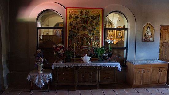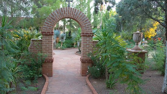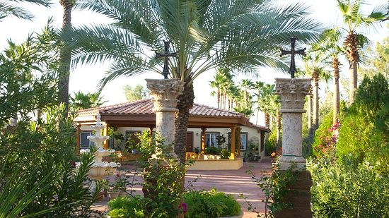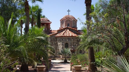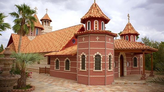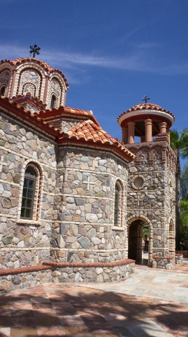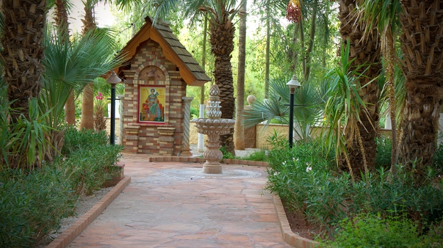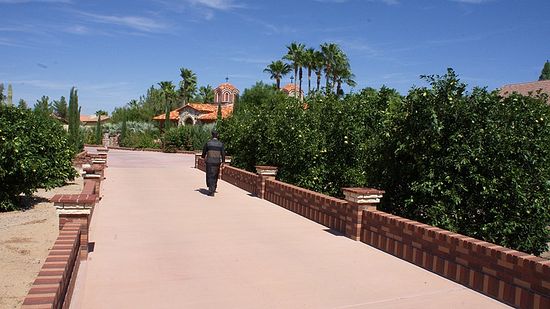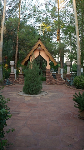 Убранство монастырского садаА в пустыне обитель была основана вот как. В штате Аризона, в городе Тусон, жил хороший знакомый старца Ефрема священник отец Антоний. И вот однажды старец отправился вместе с ним в Аризонскую пустыню, чтобы найти подходящее место для монастыря, который он очень хотел построить в уединенном месте. Они искали участок земли, выставленный на продажу, – и сейчас здесь можно видеть щиты возле дорог с надписью «Sale» и телефоном владельца участка, желающего его продать. И вот едут они по пустыне, как вдруг отец Антоний отчетливо услышал колокольный звон. «Старче, слышишь? Колокола звонят!» – воскликнул он. А вокруг не было видно ни одного строения. Отец Ефрем воспринял этот звон как указание Божие. Они тут же отправились в ближайший городок Флоренс, располагавшийся километрах в 15 от того места, чтобы узнать, не продается ли участок земли там, где они услышали звон. Оказалось, что продается. Хозяин, узнав, для чего они хотят купить землю, в два раза снизил ее цену. Отец Ефрем решил не мешкая приехать туда с братией.