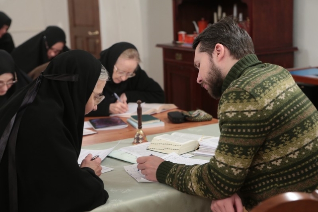 Молодой священник Димитрий Артемкин, научный редактор Церковно-научного центра «Православная энциклопедия», рассказывает, что с такой аудиторией он встретился впервые. Детскую аудиторию пастырь знает хорошо, поскольку возглавляет Воскресную школу при храме Святителя Николая в Староваганьковском переулке, где служит. Читал лекции пытливым семинаристам, впитывающим знания, словно морская губка. А как будут воспринимать и, главное, усваивать непростой материал монашествующие, у которых, помимо напряженного ритма жизни (богослужения, послушания), еще и разный духовный опыт, разный уровень знаний? Не без внутренних колебаний согласился отец Димитрий вести курс в женском монастыре, но теперь не жалеет, потому что матушки слушают лекции с живым вниманием и задают такие вопросы, что становится ясно: для них эта учеба отнюдь не формальность. Просят предоставить список литературы и выясняют, где можно найти материалы по той или иной теме. Кто-то ищет источники в Интернете, а более привычные к чтению книг идут в монастырскую библиотеку.