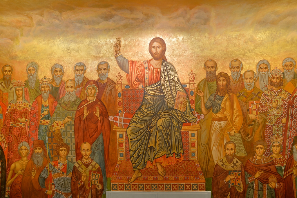 В вестибюле на первом этаже нас сразу заставляет остановиться удивительная фреска «Христос и Его ученики». В центре — Господь наш Иисус Христос, а по обе стороны — Его ученики: апостолы, мученики, святые отцы, подвижники. В этом же ряду можно увидеть Ф.М. Достоевского, Н.В. Гоголя… Они тоже ученики Христа. Здесь же и патриарх Алексий II, и отец Иоанн (Крестьянкин), и почившие монахи Сретенского монастыря.