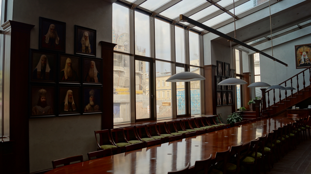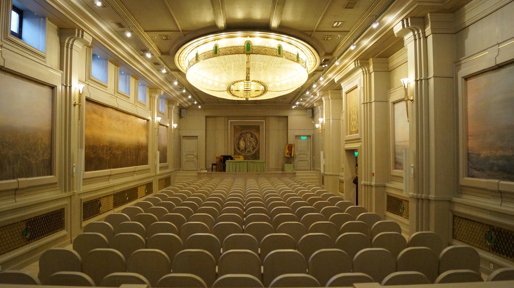 Пройдя по первому этажу, спустимся вниз, чтобы на минуту заглянуть в актовый зал семинарии. Различные собрания, встречи студентов с интересными людьми, презентации книг Издательства Сретенского монастыря — все это здесь.