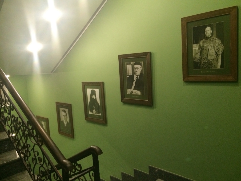 На парадных лестницах большие портреты насельников Сретенского монастыря: патриарх Сергий (Страгородский), митрополит Серафим (Чичагов), архиепископ Иларион (Троицкий), архиепископ Фаддей (Успенский), архиепископ Лука (Войно-Ясенецкий), епископ Вениамин (Милов), епископ Афанасий (Сахаров), епископ Феодор (Поздеевский), архимандрит Серафим (Тяпочкин), архимандрит Иоанн (Крестьянкин), протоиерей Алексей Воробьев, профессор Алексей Федорович Лосев и многие другие.