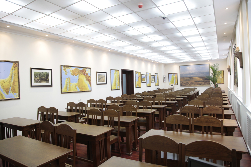 Это одна из двух аудиторий, где изучаются языки. Русский, церковнославянский, древнегреческий, латинский и английский — такова обязательная программа Сретенской семинарии. Арабский, иврит, или древнееврейский, испанский, китайский, итальянский, немецкий и некоторые другие языки можно изучать по выбору.