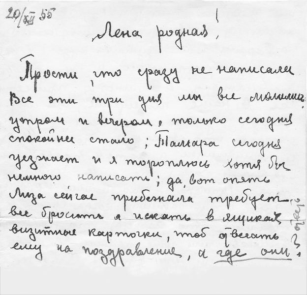 Прости, что сразу не написала. Все эти три дня мы все молились утром и вечером, только сегодня спокойнее стало. Тамара сегодня уезжает, и я тороплюсь хотя бы немного написать; да вот опять Лиза [15] сейчас прибежала, требует все бросить и искать в ящиках визитные карточки, чтобы отвечать ему <владыке> на поздравления, а где они? Ответь.