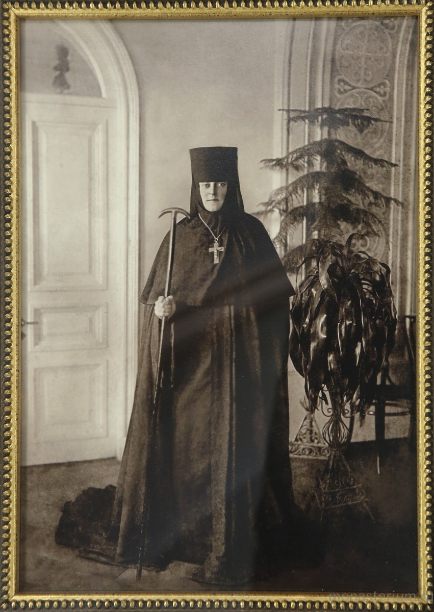 Что касается реликвий, то их приносили в монастырь и раньше. Например, в середине 90-х годов прошлого века, на заре возрождения обители, кто-то (сестры теперь жалеют, что не записали, кто именно) принес портрет святого праведного Иоанна с дарственной надписью: «Игумении Санкт-Петербургского Иоанновского монастыря Ангелине в день Ангела 8 ноября 1904 года. Протоиерей Иоанн Сергиев». А уже в нашем веке, в самом его начале, монастырю был подарен другой портрет, тоже принадлежавший матушке Ангелине, и тоже – с дарственной надписью: «Петроградскому Иоанновскому монастырю. Игумении Ангелине на молитвенную память. Макарий, митрополит Московский и Коломенский». Широко известен случай: святитель Макарий (Невский), крупный миссионер, «апостол Алтая», получил исцеление по молитвам святого праведного Иоанна Кронштадтского, с которым его связывали тесные духовные узы. Владыка, страдавший от болезни кожи около шести лет, детально описал, как сухая экзема, превратившись в мокрую, переходила с одной части тела на другую и особенно беспокоила его ночью: нужно было вставать, снимать бинты, старую мазь стирать, смывать, новую намазывать на больные места и опять бинтовать. 20 декабря (в день кончины отца Иоанна) 1913 года он был приглашен в Иоанновский монастырь служить литургию в усыпальнице, где погребен святочтимый пастырь и молитвенник. После обедни отслужил панихиду у гробницы почившего и попросил исцеления. И, по его признанию, с того же дня началось его освобождение от мучительного недуга. «Тогда мне понятно стало, что со мной совершилось чудо милости Божией по молитвам того, кто еще при жизни прославился как чудотворец», – написал Святитель. Сейчас эти портреты с дарственными надписями можно увидеть в открывшейся экспозиции. Третий портрет на витрине – портрет первой игумении обители.
