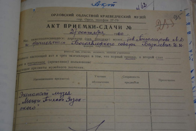Интерес к мощам проявили работники Орловского краеведческого музея, обратившись к местным светским и церковным властям с просьбой вернуть им этот «экспонат». 23 сентября того же года Н. Зверев, исполняя распоряжение Исполкома Орловского облсовета депутатов трудящихся, передал мощи святителя Тихона директору музея «тов. Кореневой» [14]. О чём и отчитался прокурору Орловской области. В письме же Орловскому епископу Иерониму Зверев напомнил, что разрешения органов советской власти на возвращение мощей из музея в церковь не было.