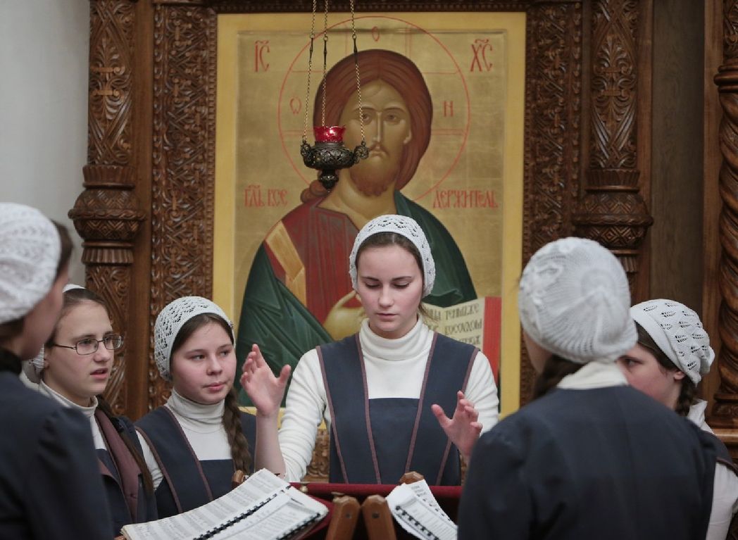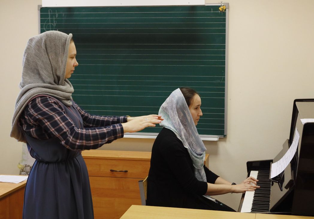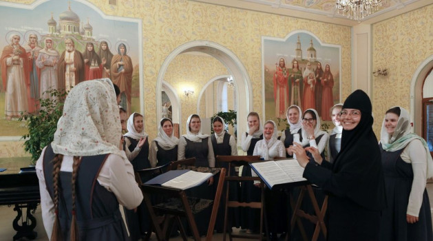 «В монастыре девочки проживают, здесь же они учатся. Учатся они бесплатно, на полном обеспечении монастыря. Питание обеспечиваем, форму шьем, и учебную, и концертную тоже, – рассказывает мать Паисия. – Практика хорового дирижирования проходит в храме. Есть череда, воспитанницы ходят на службы по очереди, а в воскресные, праздничные дни поют вместе с сестрами на два хора».