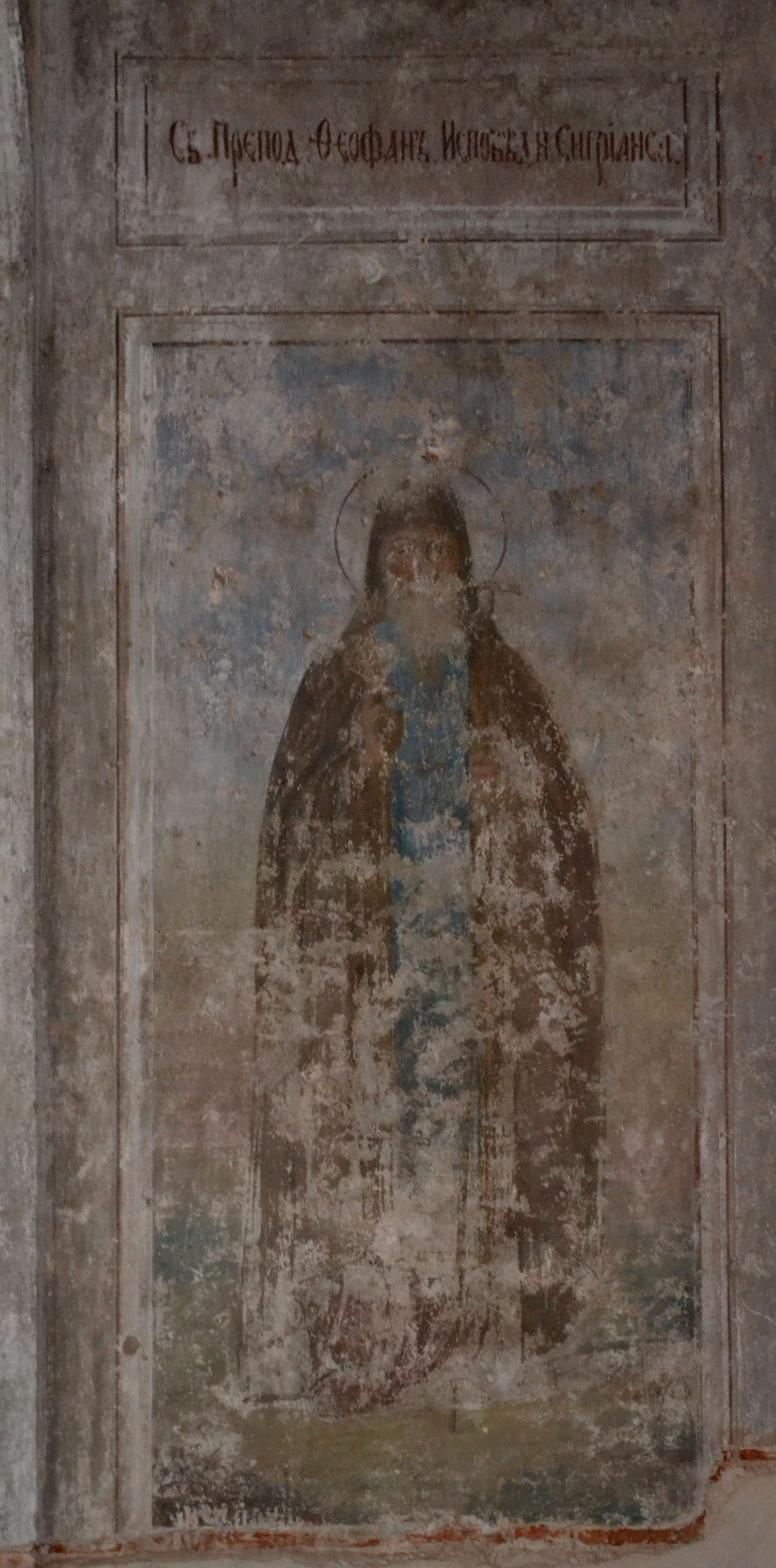Памятью о небесном покровителе святителя является сохранившаяся фреска Феофана Сигрианского в Казанском храме Вышенского монастыря, которая расположена около иконостаса в южной стороне храма. Казанскую церковь расписывали в 1875 году, тогда же был также устроен иконостас с позолоченной резьбой. В иконостасе были и три иконы кисти святителя – Воскресения Христова, – в центре, в особой нише, с правой стороны – икона Распятия Спасителя, с левой – положение Христа Спасителя во гроб. Святитель из своего затвора следил за тем, как идут работы, по окончании которых он писал: «Церковь холодную как раскрасили и поновили… Прелесть, как хороша! [6]
