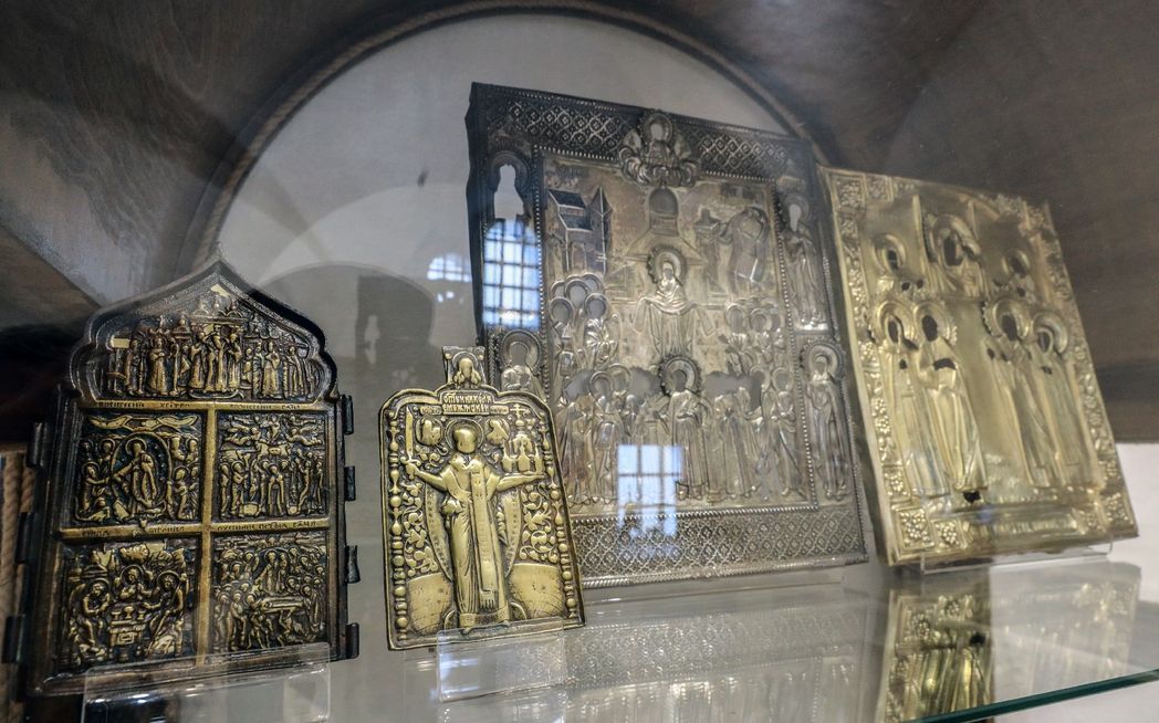 Много в экспозиционных витринах чеканных икон. Большинство найдены на территории монастыря, некоторые еще при советской власти выкопаны из земли любопытствующими мальчишками. Так была принесена и дверца печки из игуменского корпуса. После закрытия монастыря здесь располагалась школа военлётов, и так как детей тогда на волне военно-индустриальной романтики влекло все, что связано с самолетами, здесь вертелось много местной детворы. Потом повзрослев, постарев, они возвращали найденное в обитель. Сейчас приводят сюда внуков.