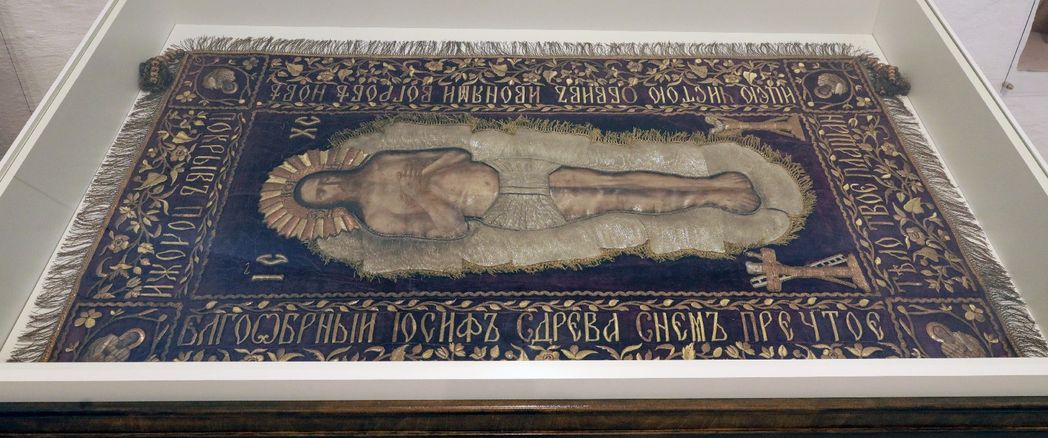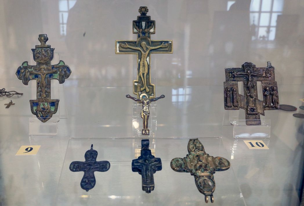 Но большинство экспонатов имеет именно богослужебный, сакральный смысл. Тут собрано множество крестов, – есть еще энколпионы, привезенные из Византии на Русь после ее Крещения; позже у нас их стали называть просто кресты-мощевики. Один из таких энколпионов был найден на территории монастыря, другие пожертвованы краеведами-любителями, прихожанами. Некоторые из представленных крестов датируются эпохой Иоанна Грозного, Бориса Годунова. Есть тут привычные нам детские, юношеские, девичьи небольшие нательные крестики. А вот главы семейств и матери носили раньше, пусть и под одеждой, но крупные кресты, причем женские часто были украшены рельефом цветов, ветвей, – «процветшие», как их еще называют.