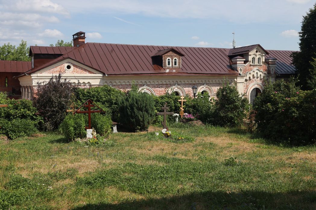 Потом, в XVI веке, в правление Бориса Годунова, монастырь был обнесен крепостной стеной; со временем в ней установили пушки, которые, впрочем, после переплавили на плиты для пола паперти Введенского собора. Но в окрестностях обители до сих пор находят огромные чугунные ядра. Одно время при монастыре состоял постоянный воинский гарнизон. Обитель была не только духовным центром молитвенных битв за Отчизну, но и военной крепостью, которая защищала рубежи на подходе к Москве. Все эти исторические вехи отображены в экспозиции.