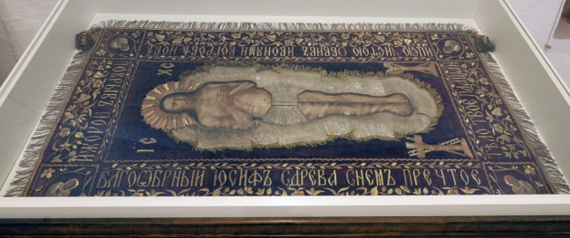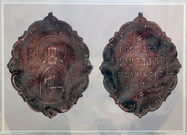 Этому видению, как и почитанию самого первого строителя монастыря преподобного Варлаама Серпуховского отведена особая часть экспозиции. Когда уже в наше время Введенский Владычний монастырь только восстанавливался, один из строителей нашел перед Алексеевским храмом медальон с изображением преподобного Варлаама, датируемый XIX веком. К тому же времени относится и представленная рядом икона. А вот более древнее свидетельство о почитании преподобного Варлаама в народе, отнесенное московскими специалистами к началу XVII века, находится сейчас в Серпуховском художественном музее – это фелонь, о которой упоминается в монастырских повествованиях.