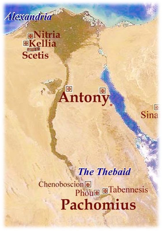Монастыри святого Пахомия Великого находились в верхнем течении Нила. Их было 11 – девять мужских и два женских. Первым местом, где основал монастырь святой Пахомий, была Тавенниси (Тавенна), потом Боу и Хенобоскион. В Тавенниси он, собственно, подвизался и руководил этим монастырем. Второй монастырь, который в свое время стал главным, – Боу – находится рядом. Все эти места нам важно географически представить. Также мы, я думаю, должны ознакомиться с тем, как близко (или, скорее, далеко) друг от друга располагались Нитрийская пустынь и Келлии, потому что часто эти места в современном представлении путешественников и паломников смешиваются.