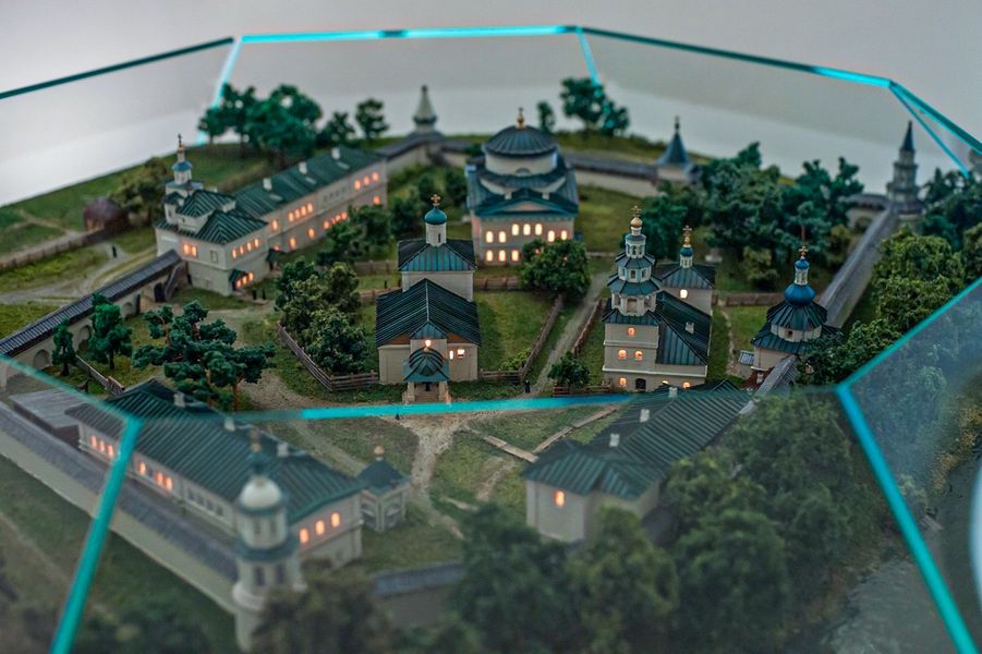 На первом этаже музея (точнее – полуподвальном), расположен уникальный макет монастыря в древности. На нем можно увидеть еще старые, не перестроенные храмы. И колокольню на том месте, где она была раньше. И корпуса братских келий в дальнем углу монастырской территории. Сейчас многое географически поменялось… А в нишах этого круглого зала находятся такие раритеты, которые вызывают душевный трепет. Самый древний из них – двухстворчатая панагия митрополита Лаврентия конца XVII века, вскрытая то ли консервным ножом, то ли просто острым ножом: видимо, богоборцы искали в ней драгоценности. По рассказу отца Гавриила, есть серьезное исследование, где рассматривается вопрос, что митрополит Казанский и Свияжский Лаврентий (он не только дал благословение на основание монастыря, но и принял самое живое участие в деле его устроения) носил древнюю панагию – возможно, что даже XIV века. Дальше – подлинное издание толкования святителя Андрея Кесарийского Апокалипсиса (Откровения святого апостола Иоанна Богослова), относящееся к первой половине XVII века. Оно украшено цветными гравюрами, и подсветка ниши усиливает впечатление. К слову, о трудах святых отцов и учителей Церкви. В Житии преподобного Иоанна Лествичника говорится, что знаменитую «Лествицу» – руководство для восхождения к духовному совершенству – святой, управлявший в то время монастырем, написал по просьбе собрата – игумена из Раифского монастыря, обратившегося к нему от лица всех иноков своей обители.