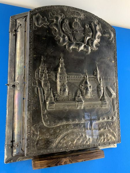Понятно, что в рамках одной статьи даже наиболее значимые музейные экспонаты не перечислить, не рассказать о них, но в последнем выпуске монастырского сборника «Раифский Альманах», представляющем собой фундаментальное издание, даны списки всех реликвий. Тема древлехранилищ дореволюционного периода и современного монастырского музея стала одной из центральных тем этого сборника. И что ценно: познакомиться с ним можно также в электронной версии, размещенной на официальном сайте обители. Я же хочу выделить из раритетов следующего экспозиционного зала уникальный ковчег с чеканкой на крышке. Он был изготовлен в размер чудотворной иконы Божией Матери «Грузинская» из серебра 84 пробы (это клеймо свидетельствовало о том, что изделие содержало в себе 84 доли чистого серебра и только 12 долей других примесей) и предназначался для перенесения святыни во время крестных ходов, совершавшихся в другие города и села. Как указывается в статье кандидата искусствоведения Екатерины Ключевской «Ковчег святыни. Из экспозиции. Музей истории Раифской пустыни» («Раифский Альманах» за 2019 год): «В целом композиция крышки ковчега соединила в одном поле нижнюю земную часть Раифской обители с окружающим ее ландшафтом, и верхнюю, небесную, с изображением Троицы и благословляющей десницы, благодаря чему вся композиция обрела некий сакральный смысл, наглядно показывая монастырь под Божией защитой». По просьбам жителей разных мест главная монастырская святыня побывала во многих местах Казанской епархии. Кстати, о крестных ходах с великой святыней можно почитать в этом зале. Отец-наместник с удовлетворением отметил, что каждый раз, заходя в музей, он видит одного-двух человек, которые внимательно читают на информационно-иллюстративных стендах текстовой материал. Значит, есть искренний интерес к истории обители!