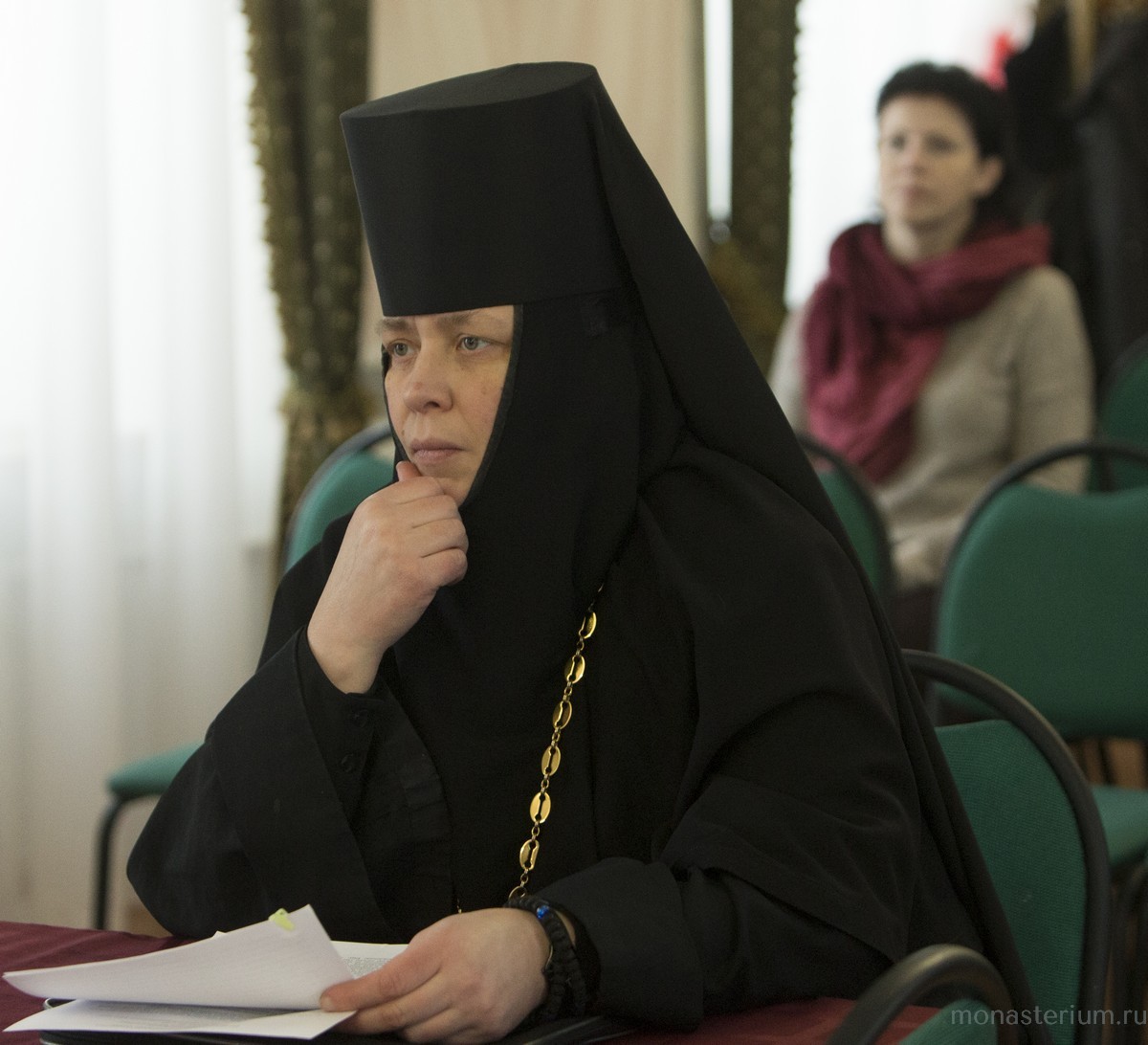 Тему важности монашеских обетов продолжила игумения Афанасия (Силкина), духовно возраставшая в Толгской обители, а в 2011 году назначенная настоятельницей женского монастыря Рождества Богородицы в Ростове Великом. В своем докладе «Монашеские обеты и их значение для спасения» матушка Афанасия обратила внимание на то, что многие вузы страны, проводя дни открытых дверей, всячески стараются заинтересовать молодежь той или иной специальностью. Педагоги и студенты рассказывают будущим абитуриентам, какое образование те могут здесь получить и как потом его употребить, чтобы принести пользу себе, своей семье, обществу. Вот и систематизированные выступления монашествующих, раскрывающие, по словам докладчицы, как прекрасна школа монашеской жизни, тоже следует рассматривать в качестве возможности обращения к молодым людям, ищущим свой путь в жизни. Игумения Афанасия заметила, что популяризация рассказов об иноческих обетах в воскресных школах, духовных семинариях способна, на ее взгляд, заставить кого-то задуматься: не выбрать ли ему высокое служение в монашестве? Особое внимание во многих выступлениях уделялось самой трудной ступени на лествице иноческих обетов – обету послушания. В докладе матушки Афанасии был приведен эпизод из Патерика Скитского «Авва Руф» о дивном видении одному старцу. Как важно донести его суть до новоначальных, которым сердце подсказало путь спасения, а пытливый ум неустанно ищет ориентиры на этом пути! Напомним этот эпизод: «Один великий старец, имея божественное видение, видел на небе четыре степени, знаменующие совершенство подвижников. На первой степени стоял недугами удрученный, но благословляющий имя Господне; на другой – бескорыстный странноприимец, и всегда услужливый; на третьей – безмолвный пустынножитель; наконец, четвертую и самую высшую степень занимал послушный своему наставнику, и ради Бога всем сердцем ему преданный. "Для чего сей, по-видимому меньший делами, возвеличен более прочих?" – подумал старец. "Для того, вдруг ответствовал ему таинственный глас, что странноприимец упражняется в добродетели, столь любезной его сердцу, по своей воле; равно и пустынник, удаленный от света по своему благорассуждению, и живет свободно; что касается до удрученного недугами, он бы с радостью переменил их на здравие. Но сей, обязавшийся труднейшим делом послушания, оставив все свои желания, зависит от Бога и своего наставника; потому он и получил большую пред ним славу"».