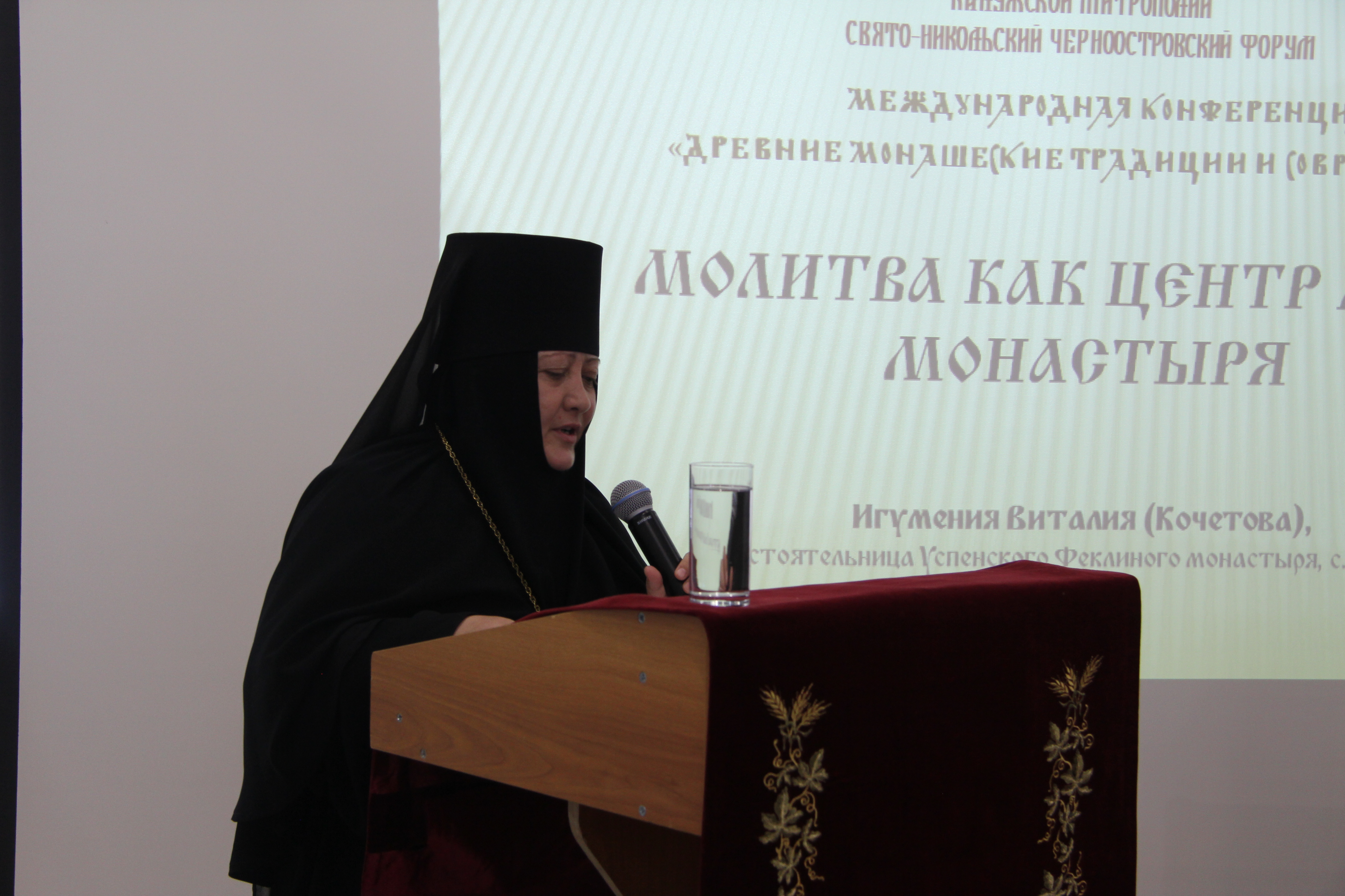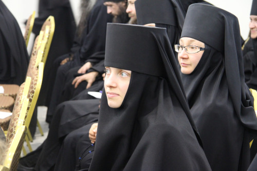 Еще две игумении из дочерних обителей – настоятельница Спасо-Воротынского  монастыря матушка Анастасия (Мордмиллович) и настоятельница Успенского Феклиного монастыря с. Сенино матушка Виталия (Кочетова) – выступили на монашеской конференции с докладами: «Монашеские обеты как основа для формирования духовно-здоровой личности» и «Молитва как центр жизни монастыря». В них были затронуты вопросы необратимости  монашеских обетов; ответственности игумена или игумении за понимание каждым братом или сестрой наиважнейшего правила монастырской жизни: посещение храма – это не формальная обязанность физического присутствия в храме, а таинственное собеседование с Богом. Цитируя преподобного Симеона Нового Богослова («Кто ропщет за обыкновенными службами, тяготится ими.., тот враг Божий и чужд Царствия Небесного»), игумения Виталия заметила, что первый признак порчи продукта определяется по гниению, изменению цвета и вкуса, появлению дурного запаха. А душа бестелесна, она не может издавать запах и менять вид. Но есть верный признак омертвения души – уклонение от церковных служб. И это представляет особую опасность для монашествующих, поскольку монастырь без молитвы – уже не монастырь, а что-то, по словам Матушки, напоминающее советский колхоз. Богослужебный круг она образно назвала золотым кольцом, которым монахи обручаются с вечностью.