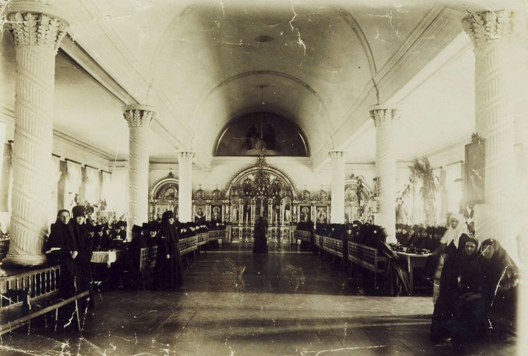 Мы прошли по монастырю. Это был ряд небольших деревянных домов, флигелей, разбросанных без особого плана и строившихся в том или другом направлении, вероятно, по желанию тех, кто здесь селился. Цветники у построек, цветы на подоконниках, щепетильная чистота в келиях, начиная с первой ступеньки крыльца, ‒ все говорило о женской руке, заботящейся о своем жилище. Тут же стояли корпуса с различными мастерскими, где та же рука беспрерывным трудом зарабатывала себе право оставаться в этом тихом приюте. Нам показали обширную живописную мастерскую, в которой, помимо писания икон, монахини практиковались и в копировании известных картин. Большое здание, просторное. Комнат много, во всех работают монастырские девушки-юницы. И в этой, и в той комнате пишут образки на камне, для печатанья, и на дощечках. Сюжеты иконописи – из жития преподобного, образ «Умиления».
